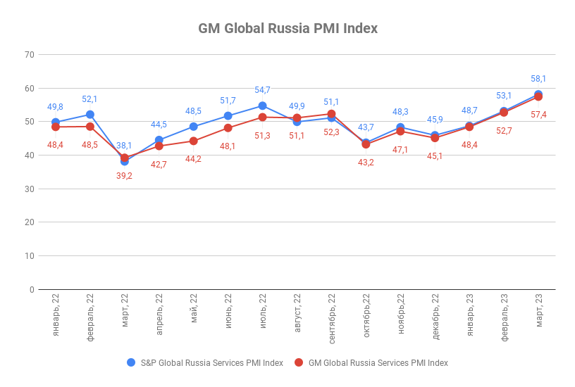 Мартовское значение индекса деловой активности ГлобалМедиа PMI (GM Global Services Russia PMI Index) составило 57,4 п.п. против 52,7 п.п. в феврале. Значение индекса деловой активности в сфере услуг от S&P Global (Global Russia Services PMI by the S&P Global) за аналогичный период выросло с 53,1 п.п. до 58,1 п.п.