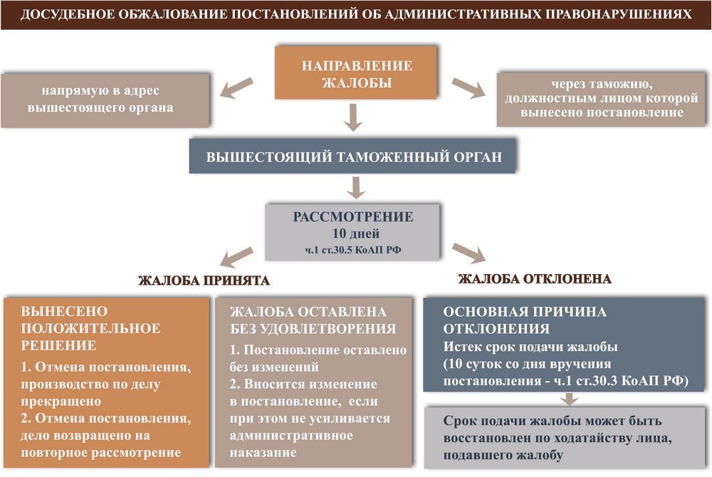 Возможность обжалования постановлений по делам об административных правонарушениях во внесудебном (административном) порядке устанавливает статья 30.1 КоАП РФ. Так, постановление по делу об административном правонарушении, вынесенное Владимирской таможней, может быть обжаловано в Центральную оперативную таможню (ЦОТ). Письменная жалоба направляется через Владимирскую таможню либо непосредственно в ЦОТ.