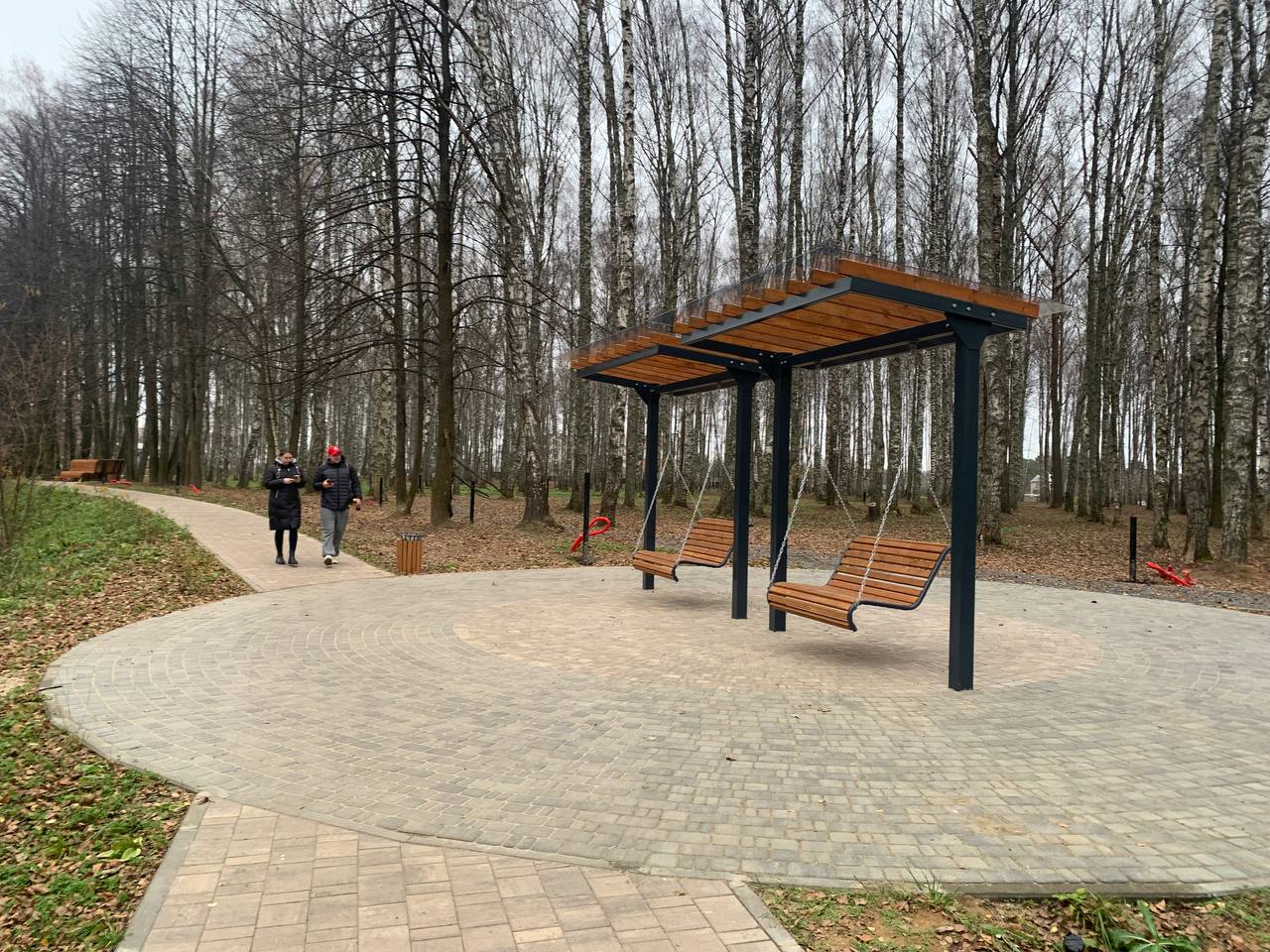 В парке «Березки» обустроили несколько видов дорожек с разным покрытием для пешеходных прогулок, бега и катания на велосипеде. Оформили комфортные локации с лавочками и навесными качелями. Подрядчик сделал спуск к мостику, который ведет к роднику.