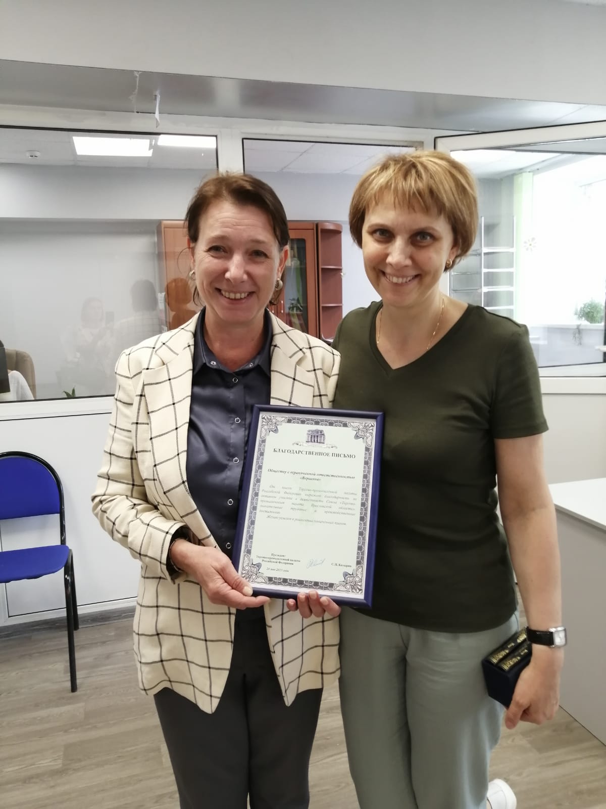 Президент ЯрТПП Наталья Рогоцкая поздравила генерального директора ООО «Вершина» Ольгу Перминову и коллектив компании с Юбилеем и вручила благодарственное письмо от Торгово-промышленной палаты России за значительные трудовые и производственные достижения!