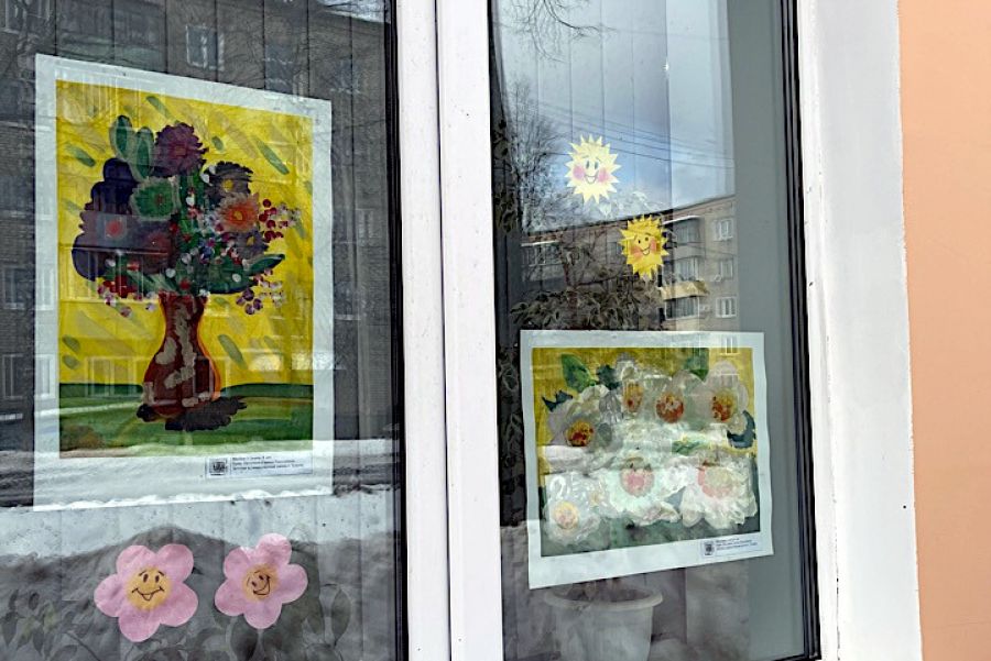 «Цветы для любимых мам» - так называется выставка работ учащихся Детской художественной школы, размещённая в окнах и приуроченная к празднику 8 Марта.