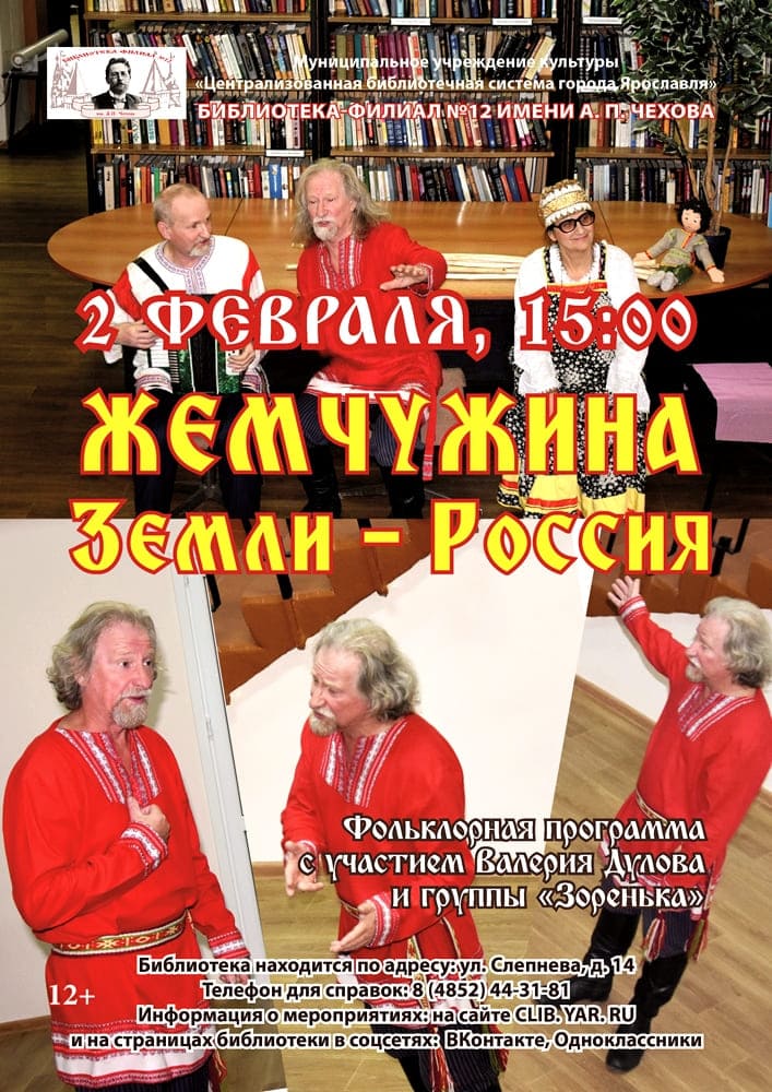 2 февраля в 15:00 библиотека-филиал № 12 имени А. П. Чехова предлагает посетить литературную фольклорную программу «Жемчужина Земли — Россия», отмененную в декабре из-за болезни артистов.