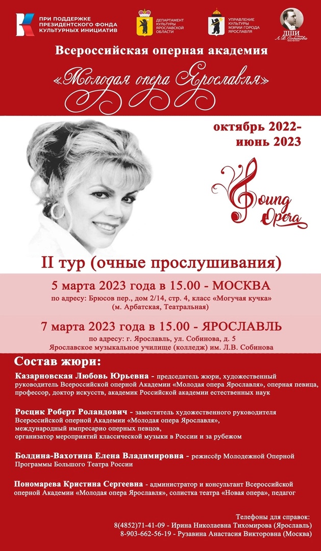 7 марта 2023 года в Ярославском музыкальном училище (колледж) им. Л.В. Собинова ( г. Ярославль, улица. Собинова, д.5) состоится Второй этап (очный) отборочного тура Всероссийской оперной академии «Молодая опера Ярославля».