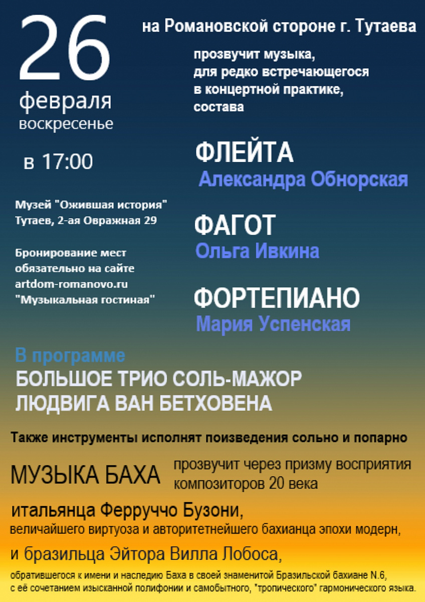 В воскресенье 26 февраля 2023 года, в 17 часов, состоится концерт классической музыки, где прозвучат произведения для флейты, фагота и фортепиано.