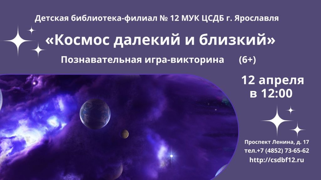 12 апреля в 12.00 Детская библиотека № 12 приглашает детей и родителей принять участие в познавательной игре-викторине «Космос далёкий и близкий», посвящённой Дню космонавтики.