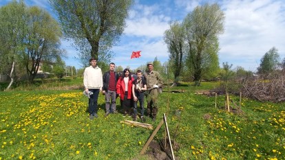 На этот раз коммунситы тоже сажали деревья и убирали мусор из Солнечного ручья. В завершении работы они установили большой плакат при входе в парк и малую табличку о проведенных посадках.