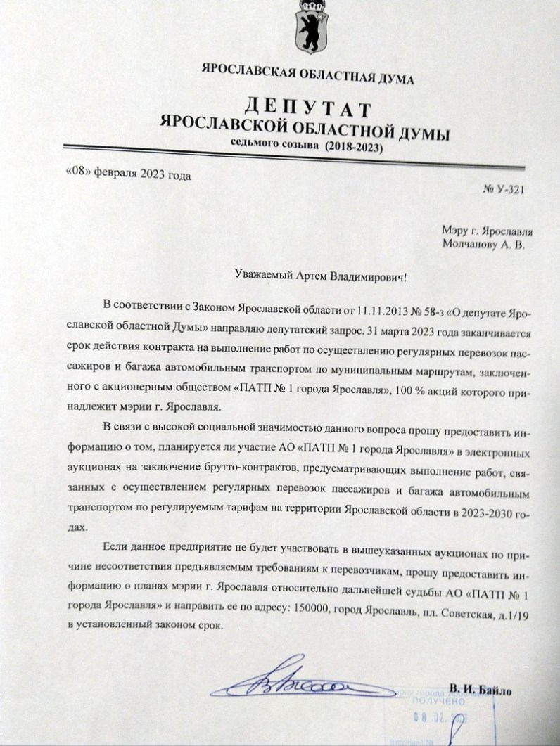 8 февраля депутат фракции КПРФ Ярославской областной Думы Валерий Байло направил мэру города Ярославля депутатский запрос с просьбой предоставить официальную информацию о планах относительно ПАТП-1.