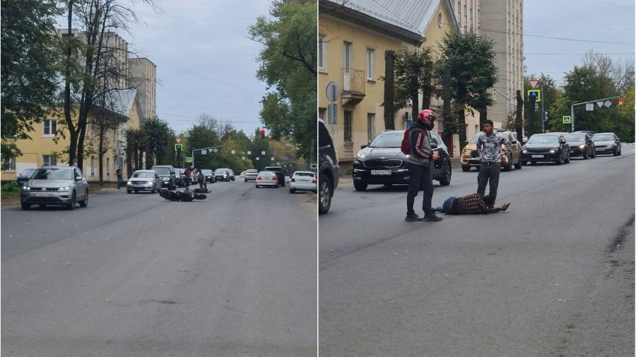 Кадры с места происшествия появились в социальных сетях. На них видно, что мотоциклист и еще один мужчина стоят рядом с лежащим на дороге молодым человеком. Транспорт находится в паре метров.