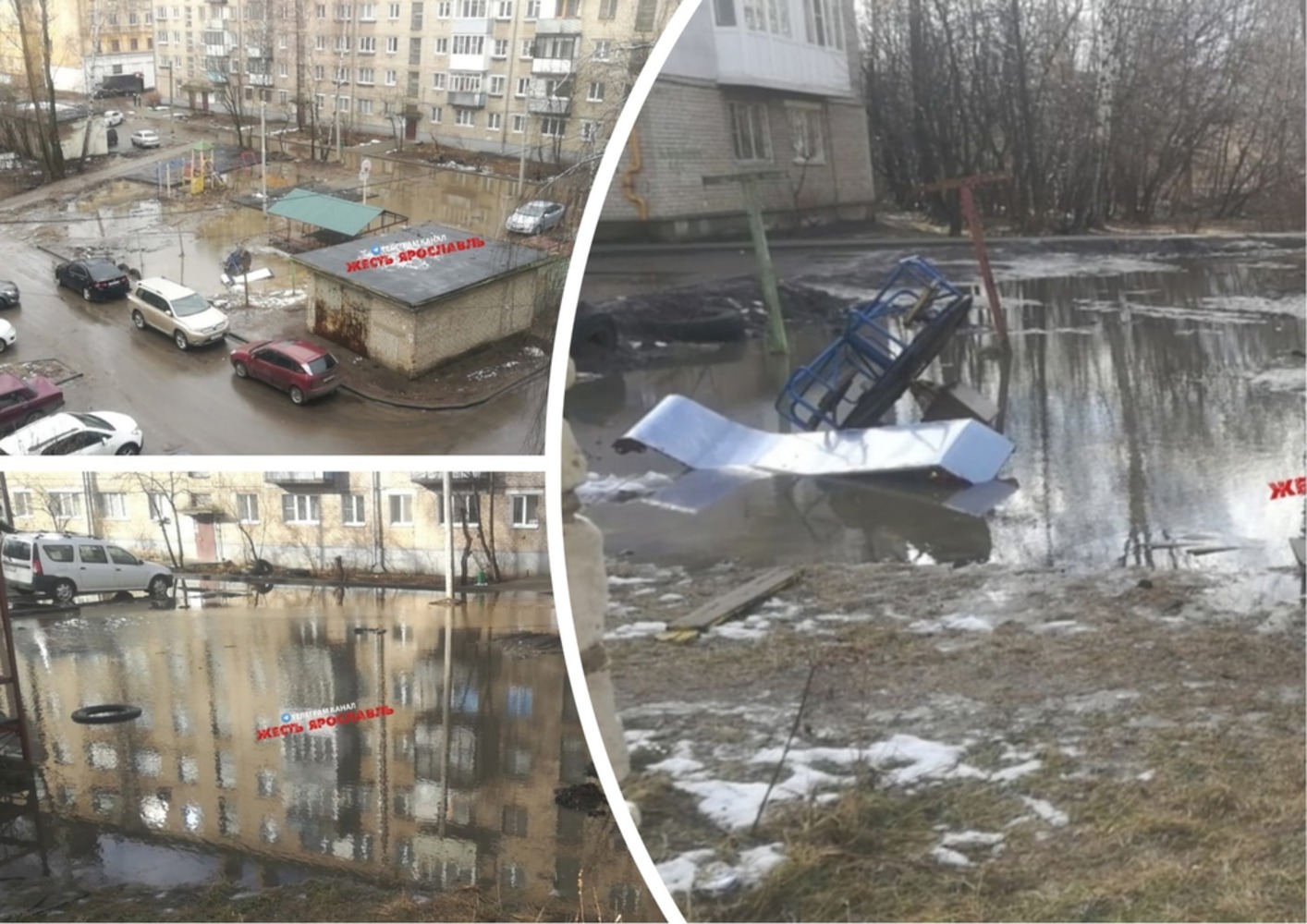 На снимках на месте детского городка теперь водоем. Действительно, похоже на болото. Не бассейн же. Как известно, установку детских городков официально перенесли на весну. В том числе работы на Пожарского. Согласно муниципального контракта, игровое оборудование и ограждение городка должно появится в этом дворе к концу мая. Именно такой срок фигурирует в муниципальном контракте. Подрядчиком выступает ярославское ООО «Резгор».