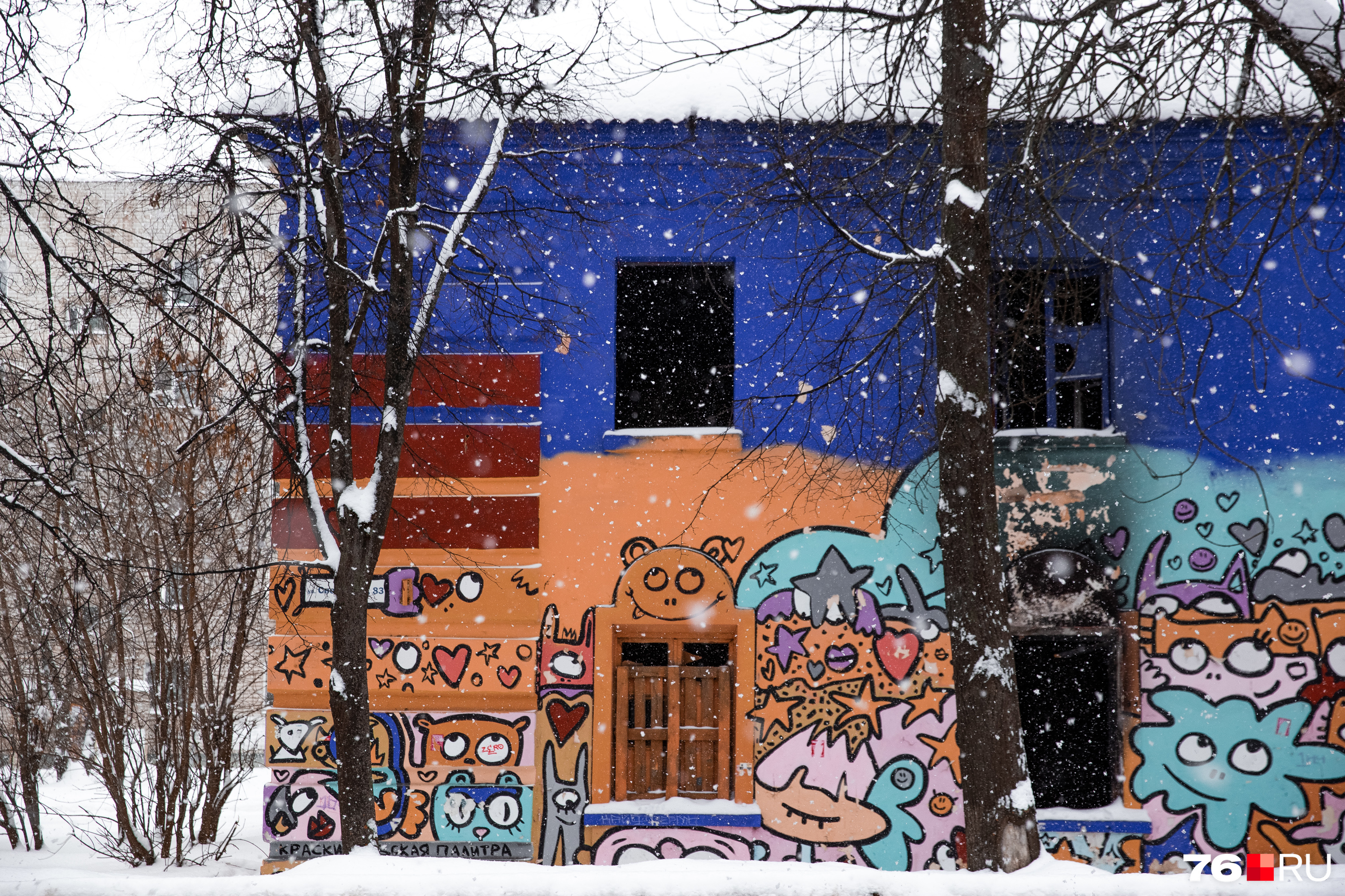 Падающие хлопья смотрятся живописно, а вот фасад — нет