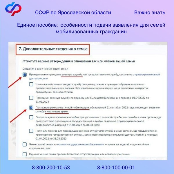 При заполнении заявления на портале Госуслуг необходимо обязательно указать статус семьи. Первую отметку надо поставить в разделе 6 «Дополнительные сведения о семье». Далее, в открывшемся списке нужно поставить галочку в третьем пункте: «Призваны в рамках частичной мобилизации, объявленной 21 сентября 2022 года, и проходят военную службу в настоящее время».