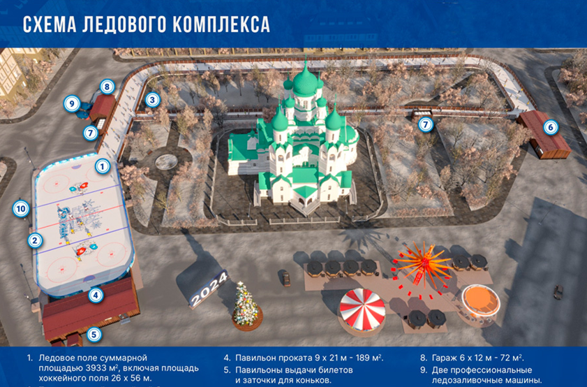 Исполнитель обязуется организовать на территории Советской площади ледовый комплекс, включающий в себя ледовый каток и ледовые дорожки площадью 3933 квадратных метра и функционально связанные с ним павильоны. Речь идет об отдельном павильоне для раздевалок, который расположится возле здания Ярославской областной думы. Сам каток будет расположен на прежнем месте и сделан по старой схеме. А вот ледовые дорожки будут размещены за храмом Ильи Пророка. Тоже в круговую, но с возможностью выезда на главный каток.