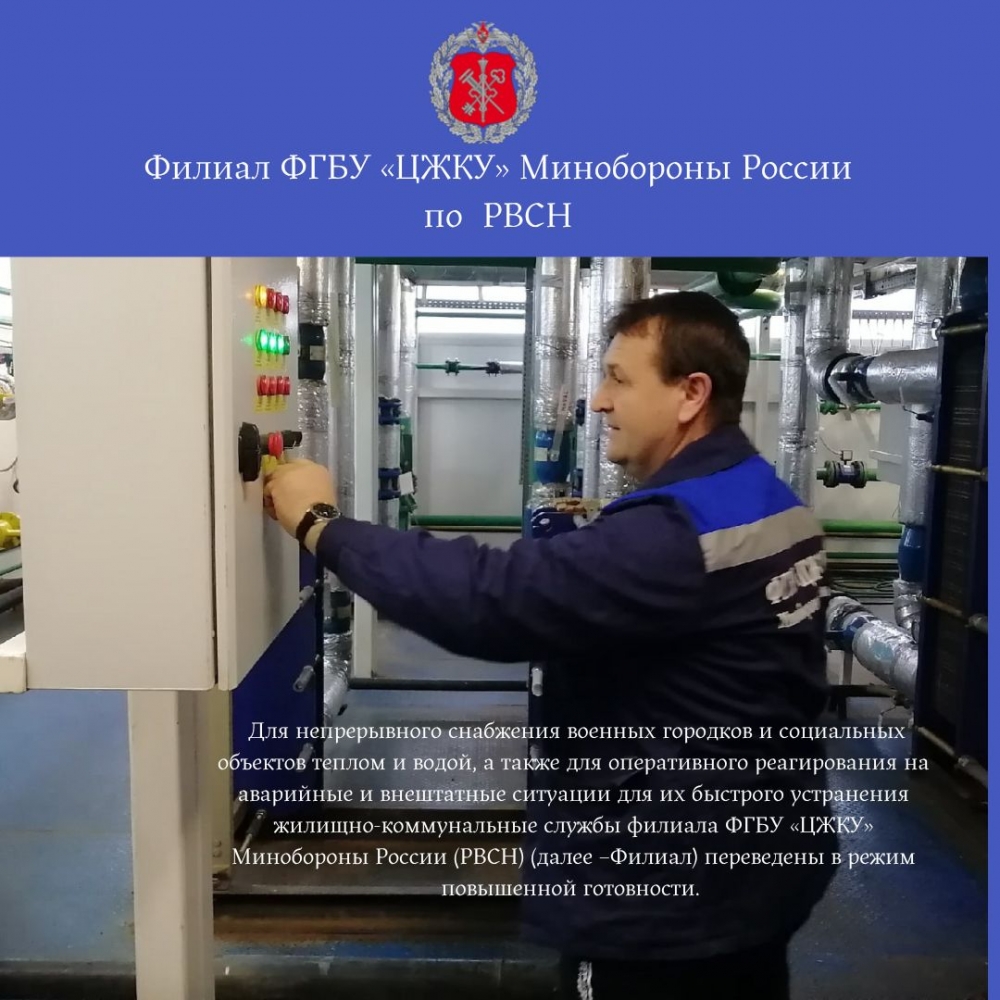 В связи с нестабильными значениями дневной температуры воздуха, нельзя допустить срывов и перебоев снабжения водой, электроэнергией, а особенно теплом жилой фонд, казармы, столовые и штабы воинских частей. Для непрерывного снабжения военных городков и социальных объектов теплом и водой, а также для оперативного реагирования на аварийные и внештатные ситуации для их быстрого устранения жилищно-коммунальные службы филиала ФГБУ «ЦЖКУ» Минобороны России (РВСН) (далее –Филиал) переведены в режим повышенной готовности.