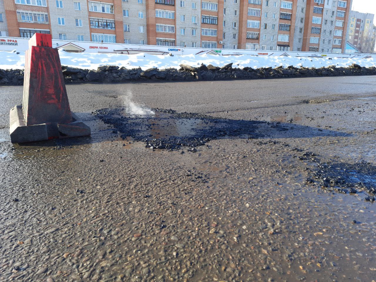 В связи с постоянными перепадами температуры происходит значительное разрушение асфальтового покрытия. Подрядная организация выполняет ремонт особо опасных ям.