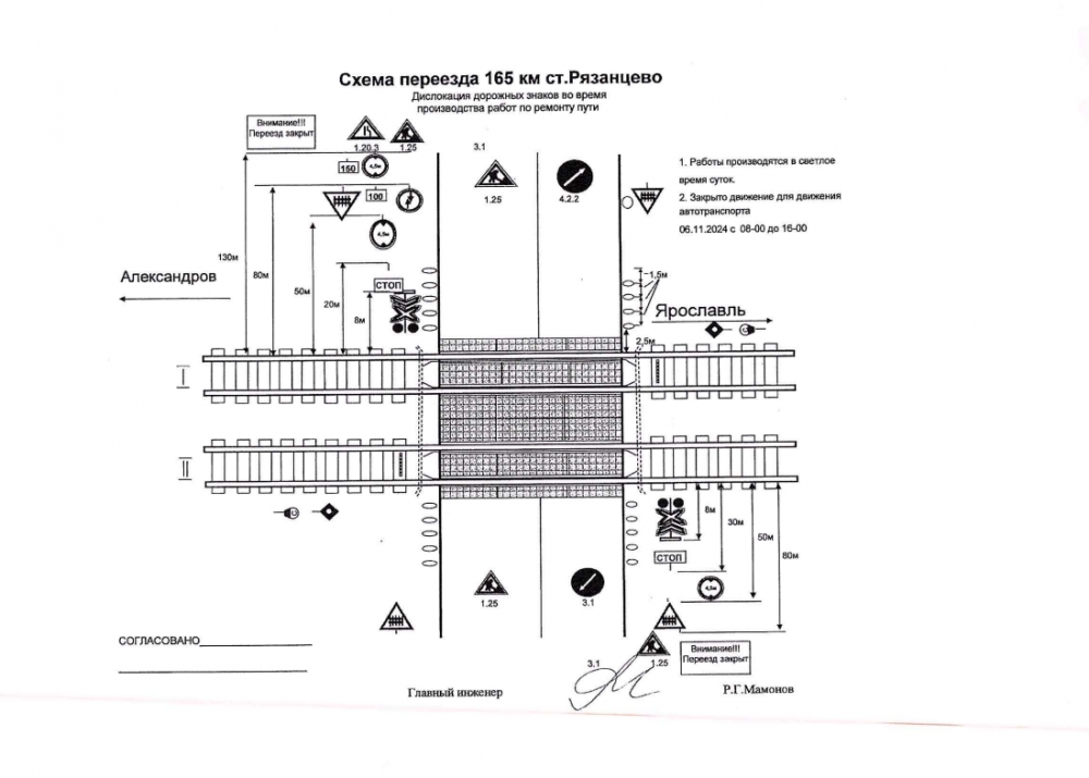 Внимание! Для обеспечения безопасности движения поездов по перегону Рязанцево - Беклемишево на переезде 165 км 221 (а/д Юрьев-Польский – Рязанцево – Переславль) необходимо выполнить работы по ремонту пути.