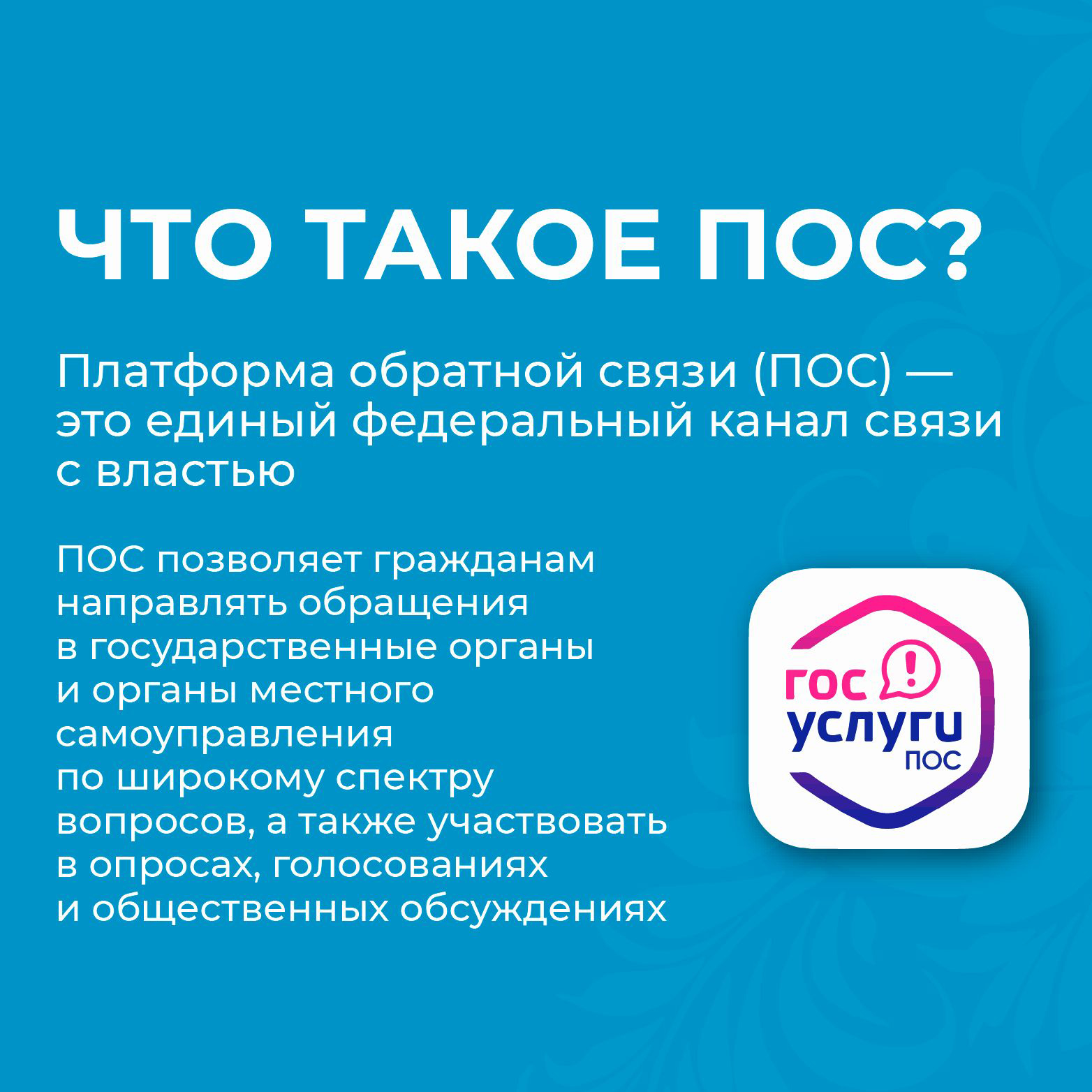 Платформа обратной связи (ПОС) позволяет гражданам через форму на портале Госуслуг, мобильное приложение «Госуслуги. Решаем вместе» ( appstore , rustore ), а также виджеты на сайтах органов власти субъектов РФ направлять обращения в государственные органы и органы местного самоуправления по широкому спектру вопросов, а также участвовать в опросах, голосованиях и общественных обсуждениях.