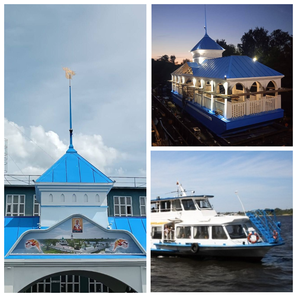 Новый причал, предназначенный для приёма теплоходов у Свято-Введенского Толгского монастыря под Ярославлем спущен на воду и готовится к буксировке.