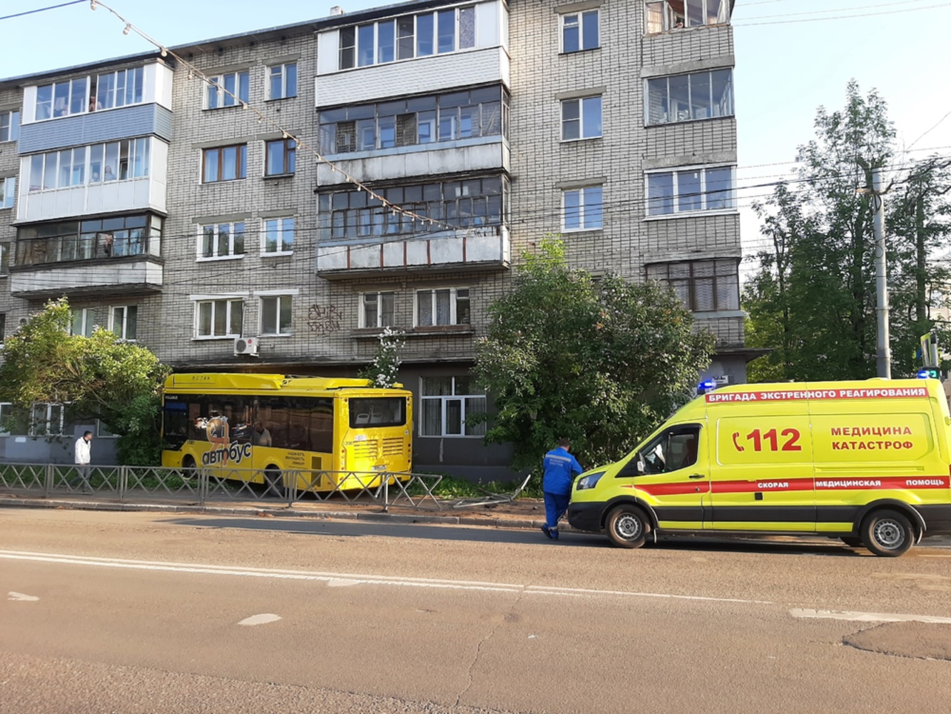 В центре Ярославля жёлтый автобус выехал на тротуар и врезался в дерево