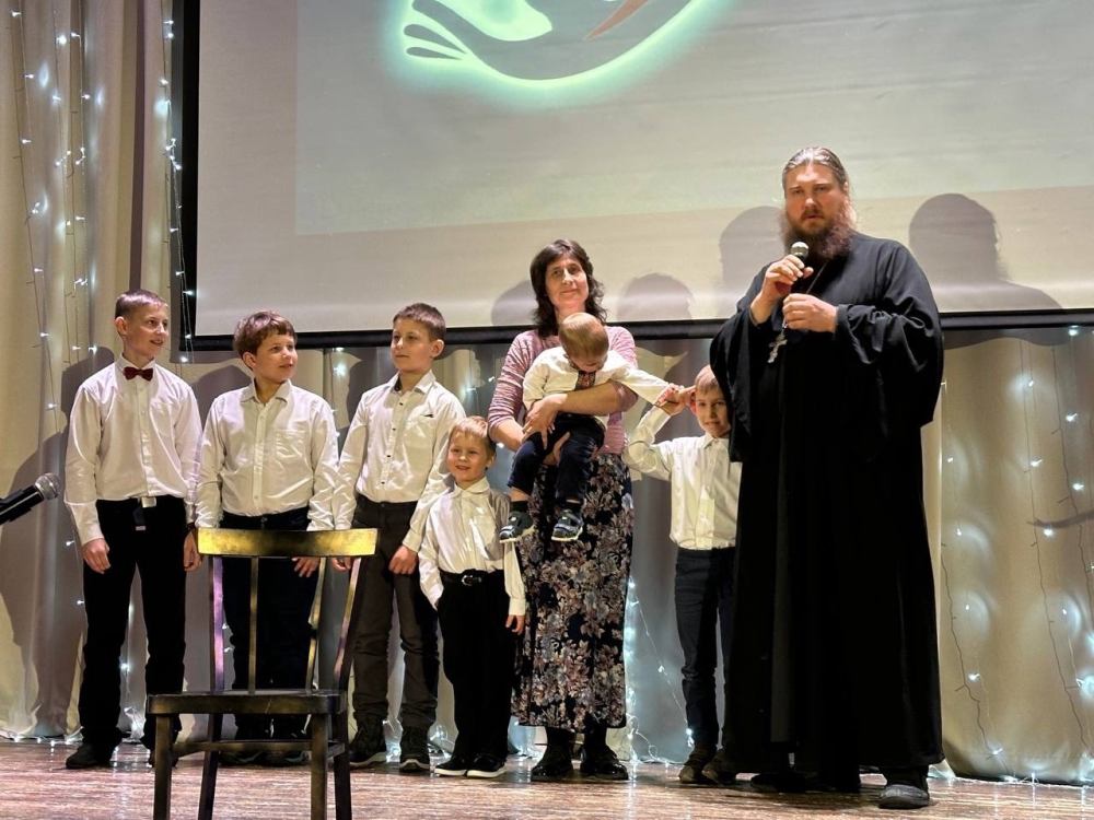 В зале присутствовали семьи, где очень любят детей и их много. Например, в семье Новиковых 10 детей. Ведущими выступили семья Рожковых - мама Светлана с дочерью Елизаветой и семья Орловых - мама Оксана с сыном Дмитрием.