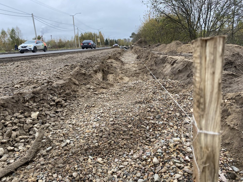 На другой стороне дороги корреспондент увидел единственного рабочего, который укрыт от холода и рассыпает гравий на пешеходной части. Небольшой погрузчик подвозит новые порции щебенки, а впереди готовится основание под асфальт.
