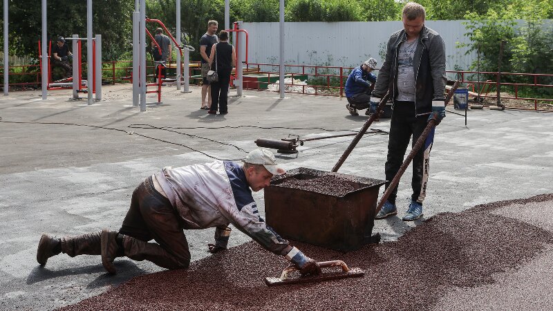 Для безопасности детей покрытие площадки будет выполнено из резины. Работы строители должны завершить к четвергу.