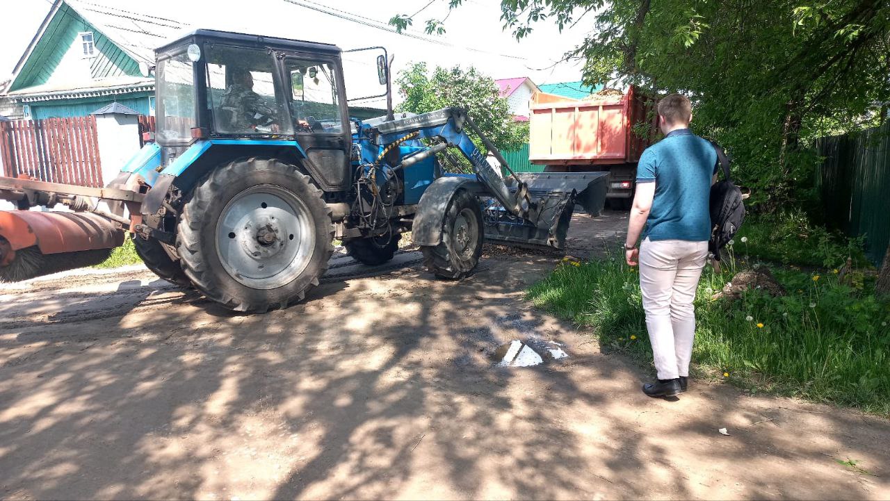 Сегодня работы по подсыпке и планировке дороги прошли в 1-м Суздальском переулке.