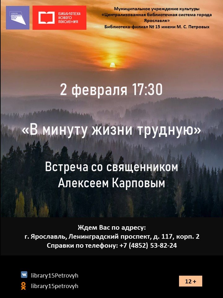 2 февраля в 17:30 в библиотеке-филиале № 15 имени М. С. Петровых пройдет встреча со священником «В минуту жизни трудную».