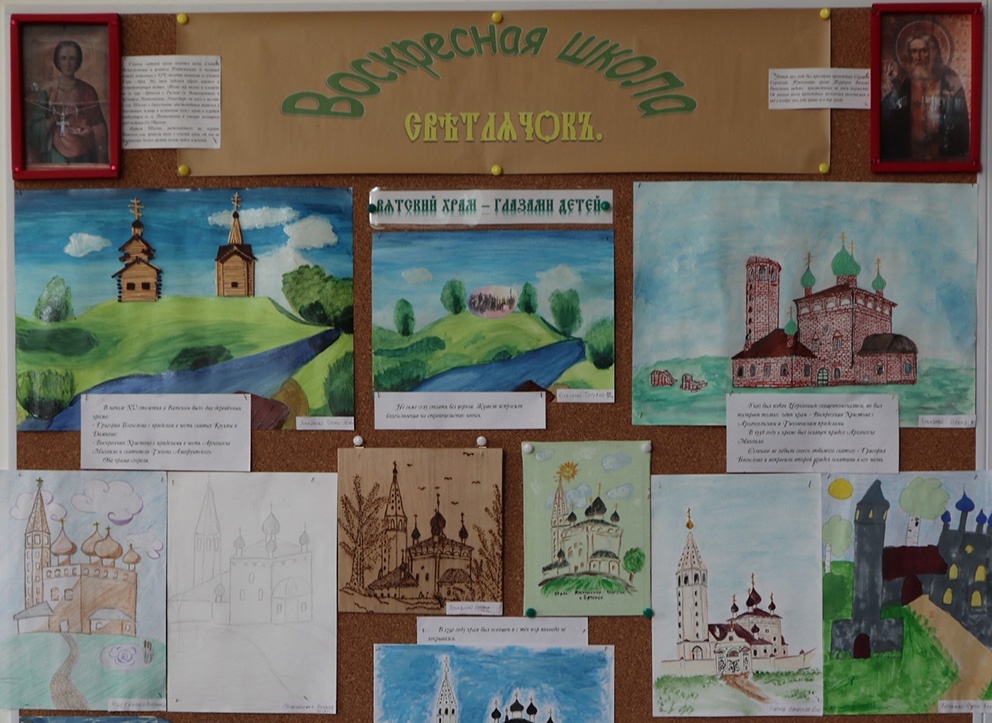 К завершению учебного года учащиеся воскресной школы Воскресенского храма с. Вятское подготовили для прихожан замечательный подарок. Их стараниями оформлен стенд «Вятский храм — глазами детей».