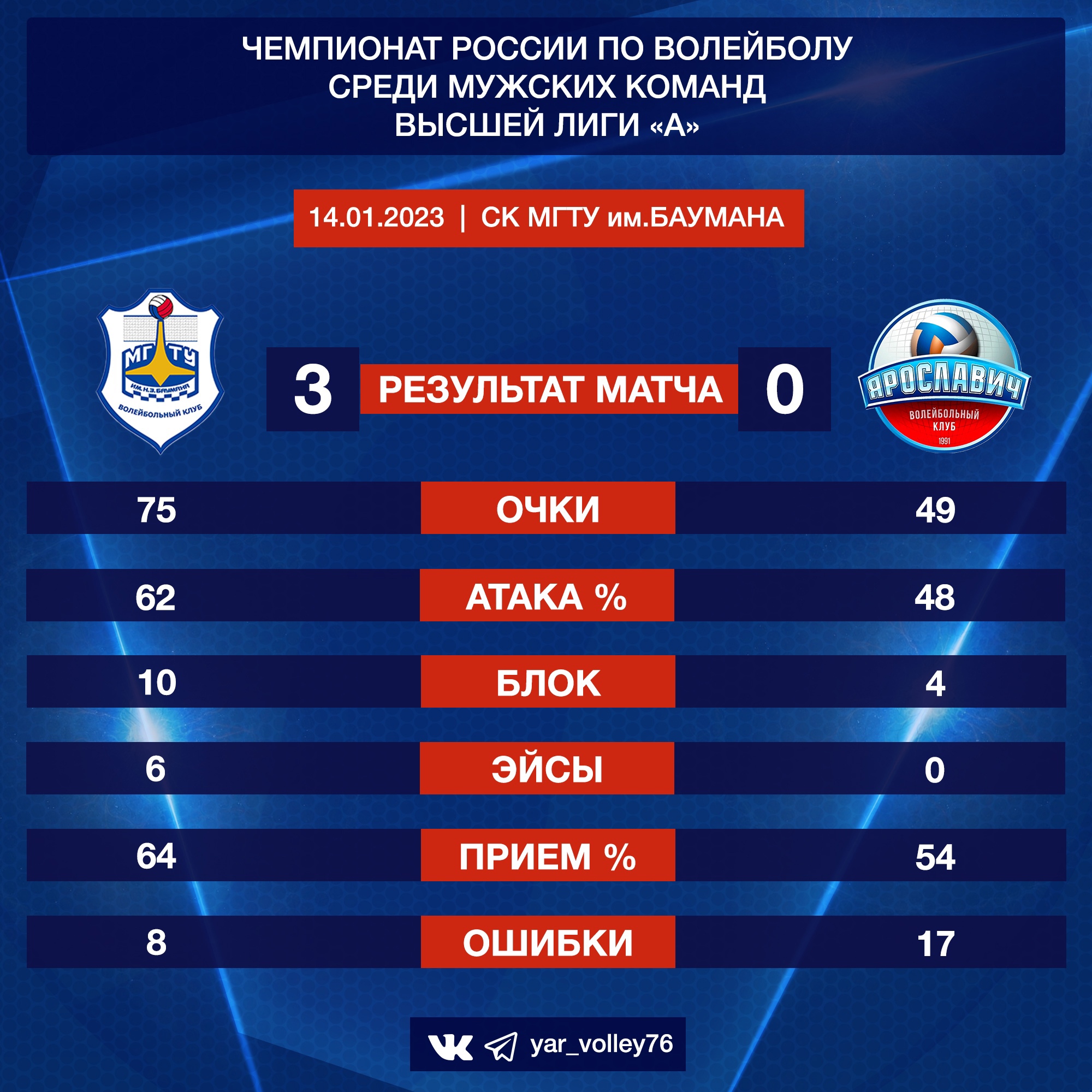 МГТУ - « Ярославич » - 3:0 (2 5:16, 25:18, 25:15)МГТУ: Гафаров (1 очко), Никифоров (19), Бестужев (15), Пискарев (12), Кассель (5), Снегирев (6), Касаткин (л) - стартовый состав, Макаров (1), Худяков.