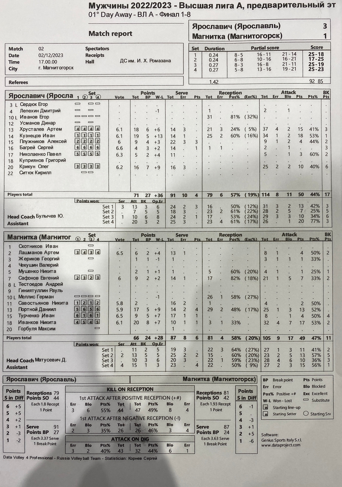 Самым результативным игроком в составе «Ярославича» стал доигровщик Иван Кузнецов, заработавший 19 очков. Успех в сегодняшнем поединке волжанам во многом принесли удачные действия на блоке - 17 результативных действий против 11 у магнитогорцев.