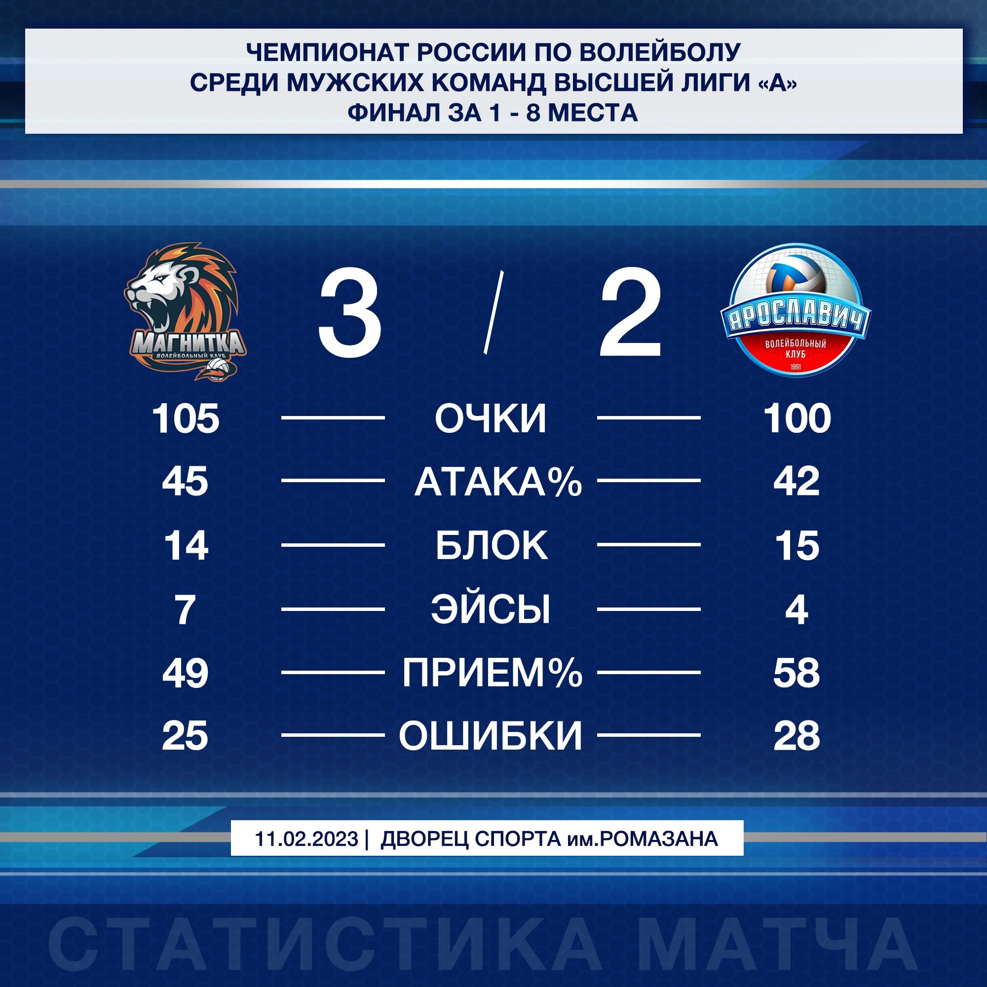 Сегодня в первом матче 1 тура Финала за 1-8 места Высшей лиги «А» волейбольный клуб «Ярославич» уступил в Магнитогорске местной «Магнитке» со счетом 2:3 (22:25, 27:25, 25:15, 16:25, 10:15).