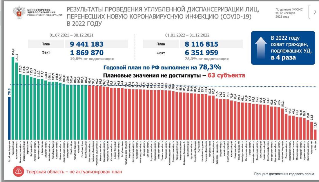 Годовой план по углубленной диспансеризации лиц, перенесших новую коронавирусную инфекцию (COVID-19), в России в 2022 году выполнен на 78,3%. Плановые значения не достигнуты в 63 субъектах федерации. В их числе — Ярославская область, которая с результатом 44,3% расположилась на 77 месте по России. Справедливости ради отметим, что на последнем месте рейтинга — Москва с показателем 18,8%.