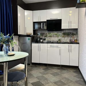 Предлагается дизайнерская квартира-студия со всеми удобствами,для тех, кто ценит уют и изысканность. Во дворе- Парковка, детская площадка. Первый этаж для удобства заселения и наличие балкона с искуственной травой делают наши апартаменты максимально комфортными. Смарт ТВ, домофон, кофемашинка с кофе, чай, свежее пастельное бельё и банные принадлежности ждут наших гостей. Индивидуальное отопление. В холодное время - тёплые полы. В жаркий период- вентилятор.
